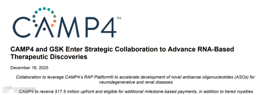 2025年12月18日,CAMP4 Therapeutics,一家致力于开发针对遗传疾病RNA疗法的临床阶段生物制药公司,宣布已与葛兰素史克 (GSK) 达成一项战略研究、合作和许可协议,共同识别并开发针对神经退行性疾病和肾脏疾病相关多个基因靶点的反义寡核苷酸(ASO)候选药物。
