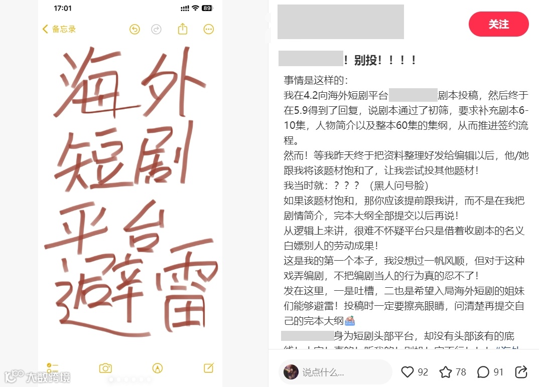 有编剧分享了自己今年向某头部海外短剧平台投稿剧本的经历: