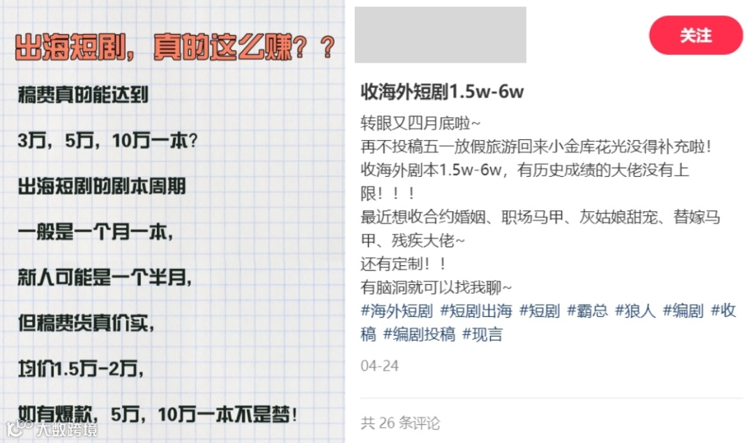 随着短剧“出海热”出现,越来越多人认知到这片亟待开荒的沃土。借着这股子出圈的东风,很多社交媒体上出现了“收海外剧本”的吆喝,大多要求提交【大纲+人物小传+前5-10集剧本】,并强调需要“好莱坞格式”。
