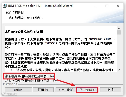 5.点选“我接受许可协议中的全部条款”,点击“下一步”