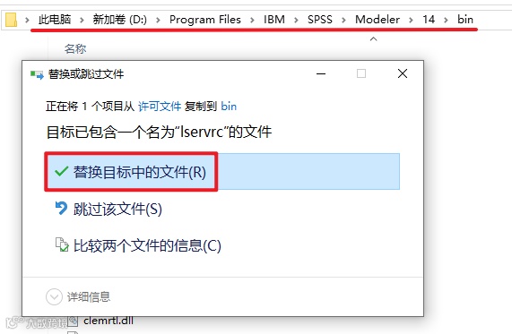 14.依次打开软件安装路径“D:\Program Files\IBM\SPSS\Modeler\14\bin”,粘贴复制的文件到该路径下,选择“替换目标中的文件”