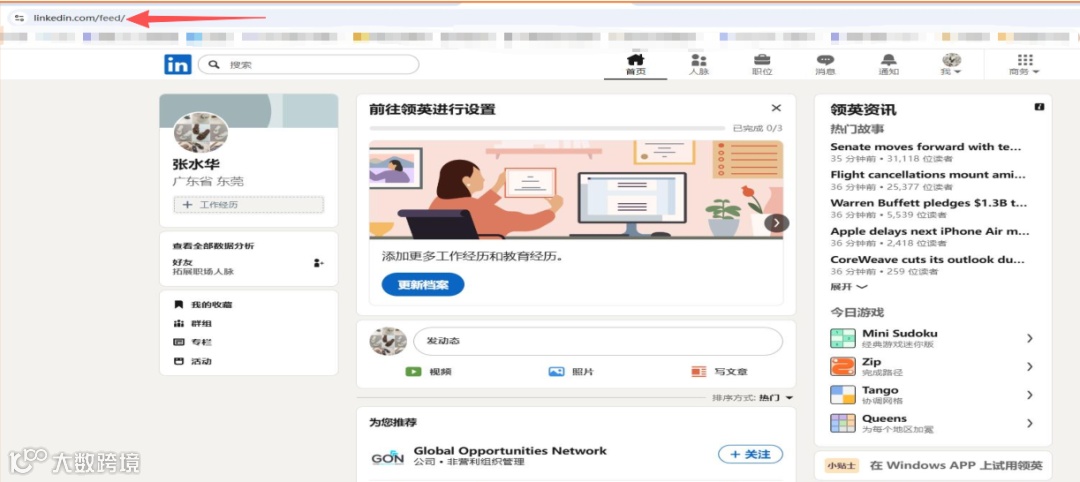 打开 google 浏览器(需要使用正确上网工具),直接输入领英国际版网址 www.linkedin.com,用同样的邮箱账号和密码即可登录。