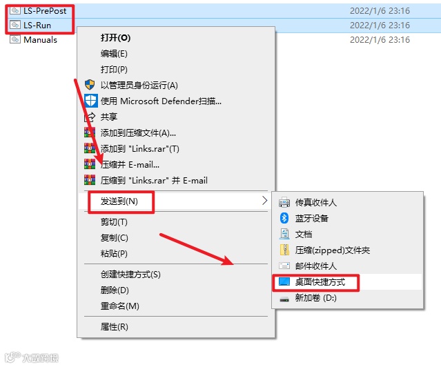 20.返回D盘软件路径:D:\LS-Dyna\Links,分别选中”LS-PrePost.bat“和LS-Run.bat文件生成桌面快捷方式