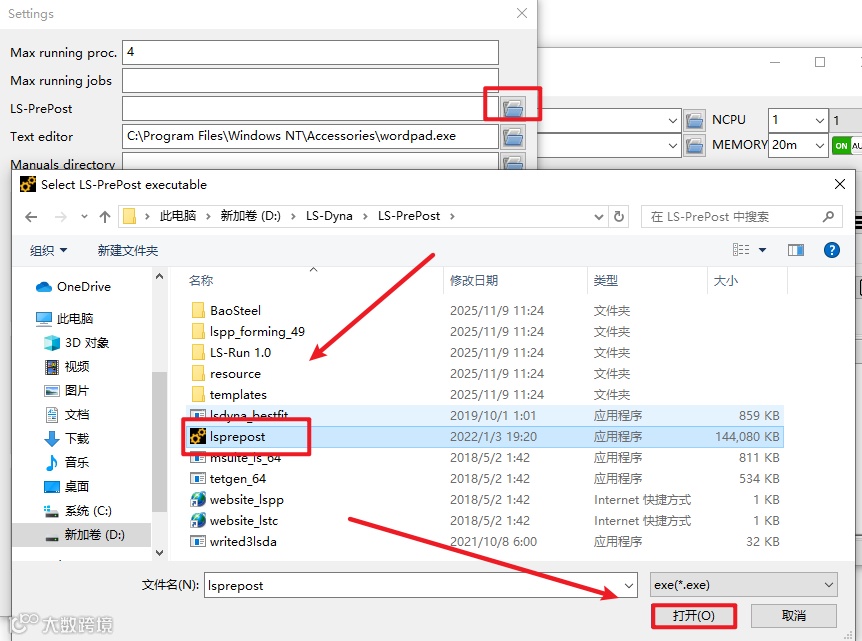 18.设置LS-Prepost位置,选择软件安装路径D:\LS-Dyna\LS-PrePost文件夹下的lsprepost文件,点击”打开“