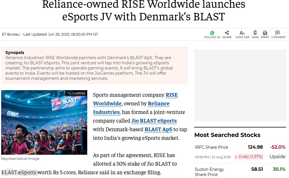 Reliance与丹麦电竞机构BLAST合作成立Jio BLAST电竞合资公司,加速布局印度电竞生态。