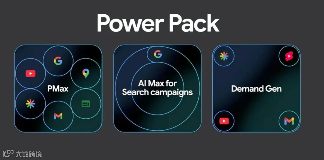 2.谷歌推出了“AI Power Pack"(能量包)结合了 PMAX、Al Search Max和升级版 Demand Gen 的优势。这三款产品使广告商能够利用全面的人工智能驱动功能进行创意生成、受众定位和跨渠道广告活动投放。