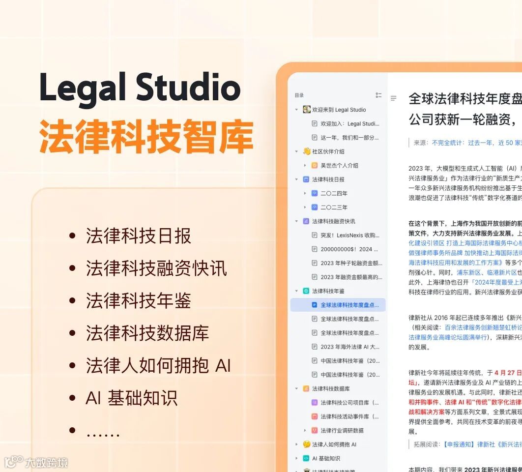 法律修音机(Legal Studio)是一个具有全球视野的法律科技自媒体,也是个高质量的交流社区,致力于传播全球法律科技的前沿资讯和深度内容,让好产品和好内容被看见。