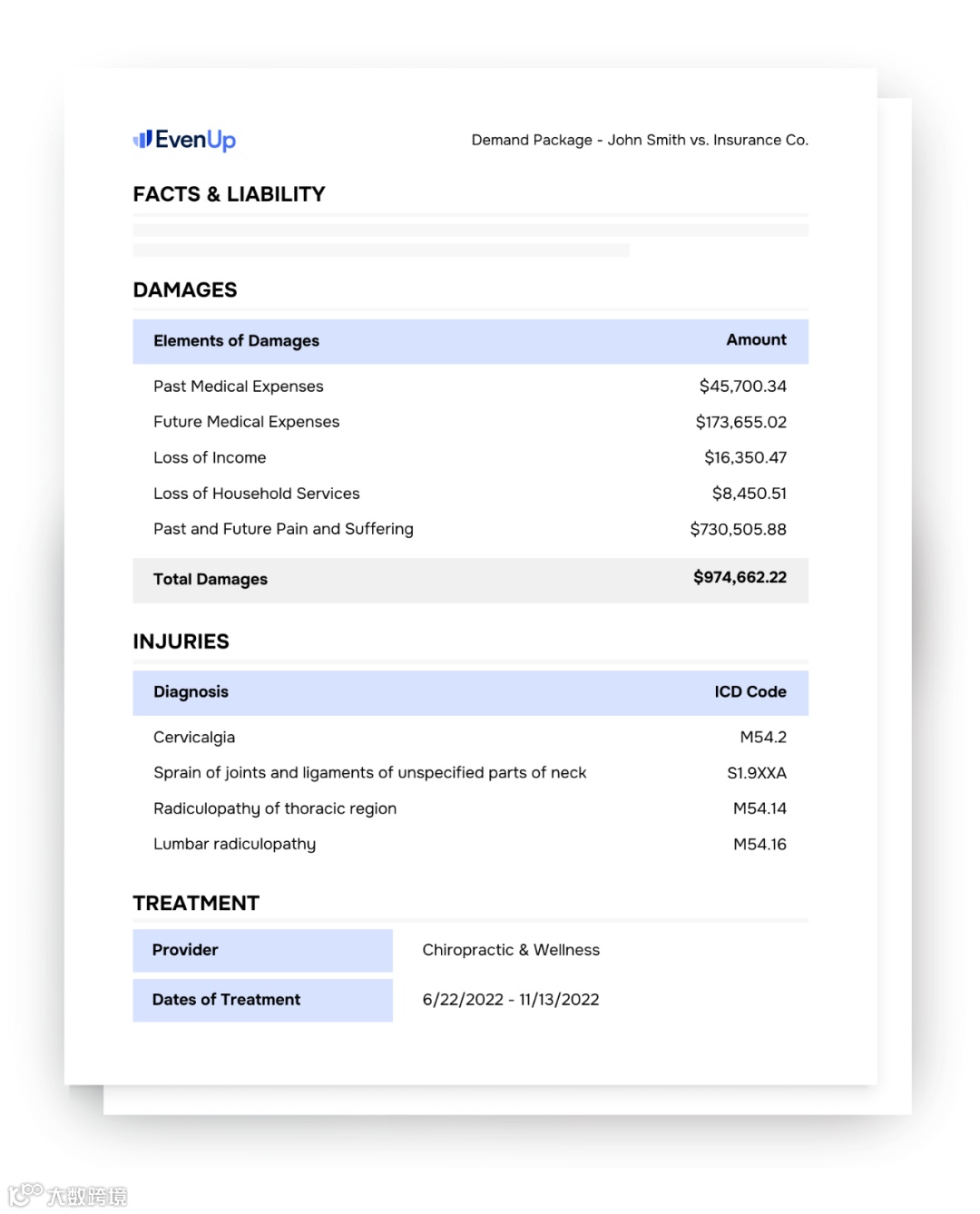 通过将 AI 技术和专业数据相结合,EvenUp 可提供丰富且完善的医疗摘要,包括标记丢失的账单或者记录、每种损伤的国际疾病代码、医疗服务提供者的概要、治疗日期、就诊次数以及每次就诊的关键要点等等。