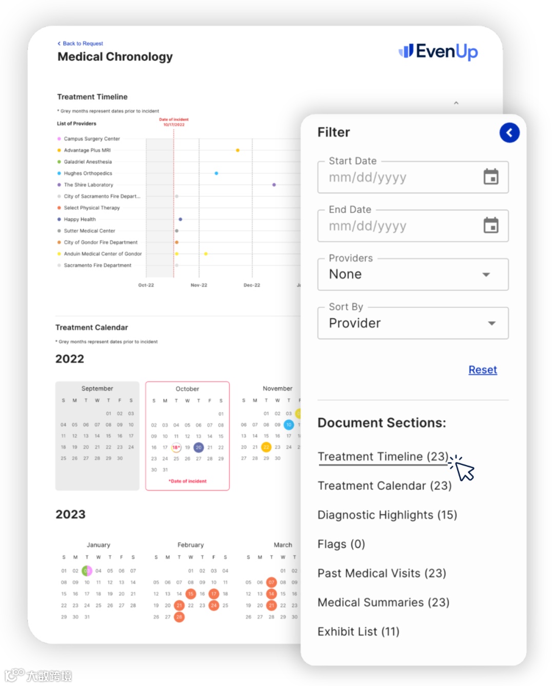 通过 EvenUp 的在线交互式医疗年表,律师可以查看医疗时间轴并与之交互;筛选、排序并跳转到特定部分;通过证据超链接快速找到需要的信息;按时间顺序或按医疗服务提供者组织医疗总结部分,并轻松地来回切换。