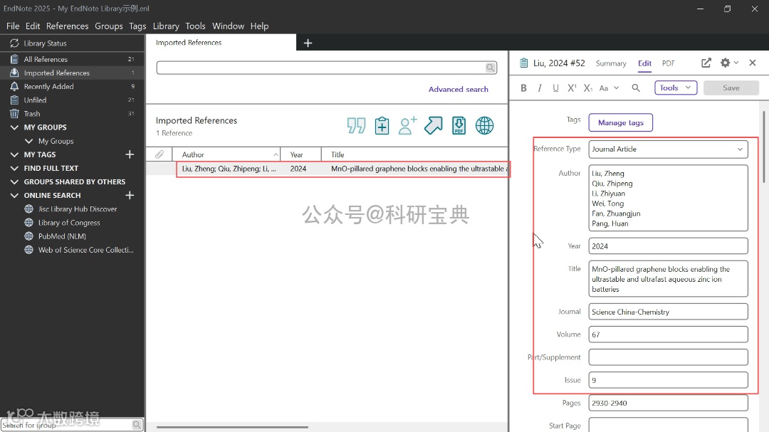 5. 等待导入完成,即可在EndNote中查看完整文献信息;