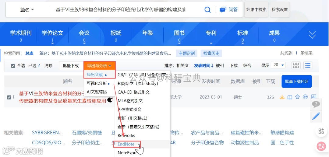 8. 勾选文献后,点击【导出与分析】→【导出文献】→【EndNote】;