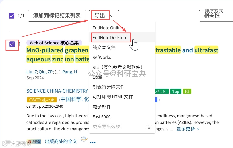 2. 找到目标论文后,点击【导出】→【EndNote Desktop】;