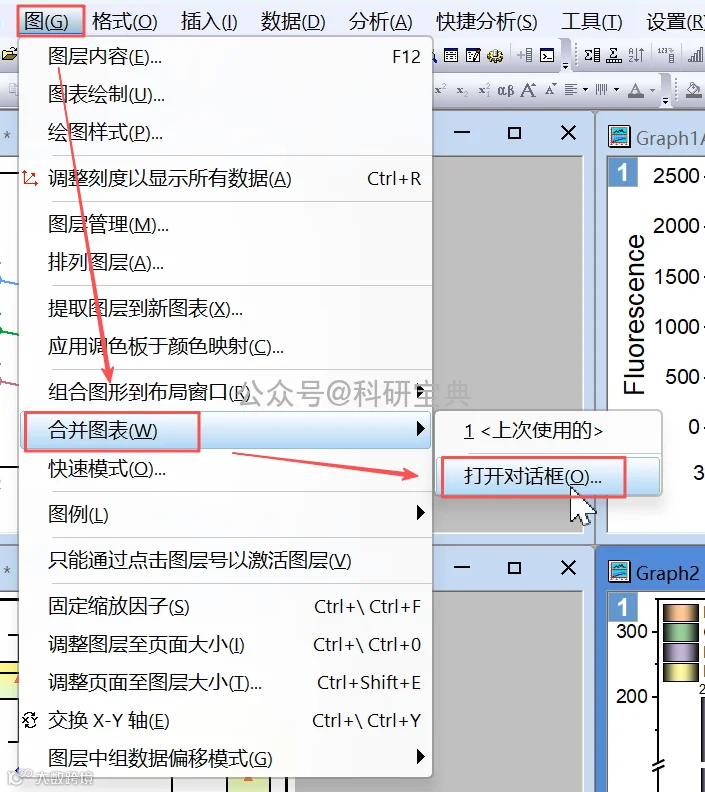 1. 点击【图】-【合并图表】-【打开对话框】,使用Origin自带拼图工具;