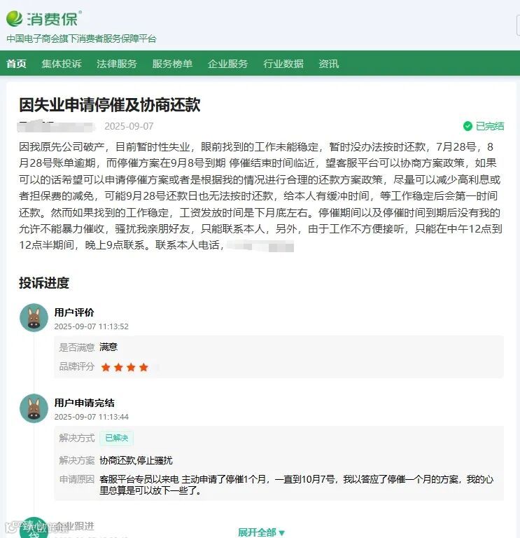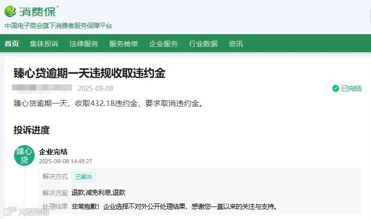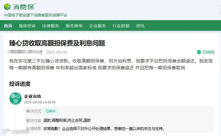 消费保已针对“臻心贷”开通绿色投诉处理通道,助力消费者高效维权。