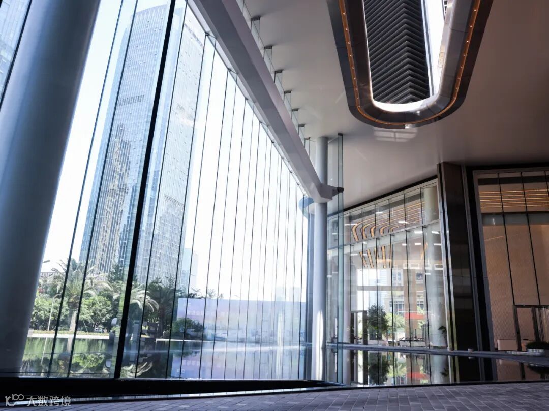 首层18米挑高的剧院式大堂空间,实现顶天立地、一镜到底的震撼观感。通过大悬挑、大跨度结构实现无柱化开放布局,提升空间自由度与互动性。