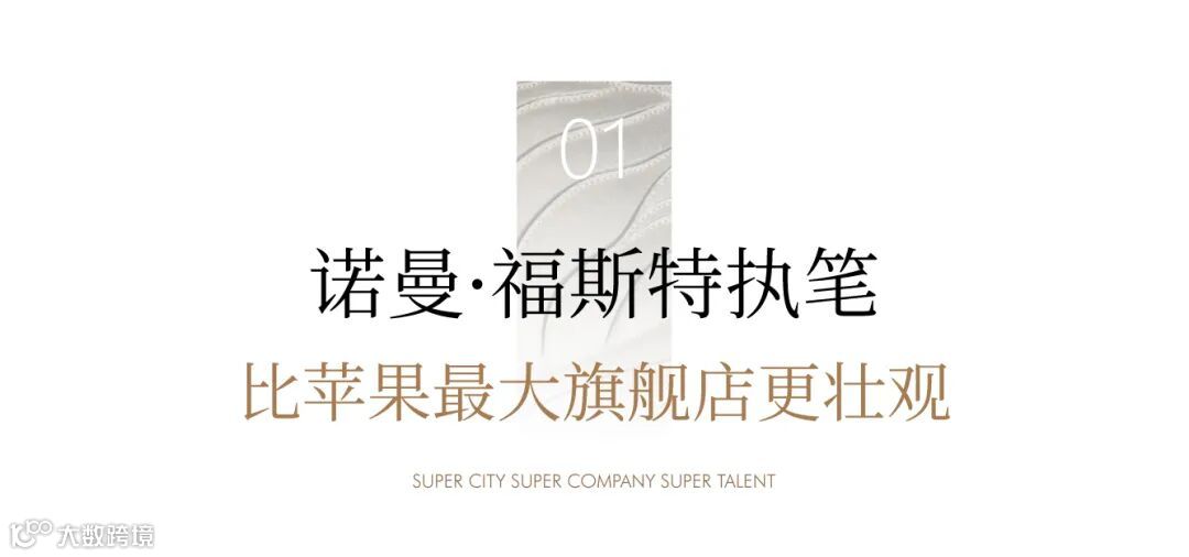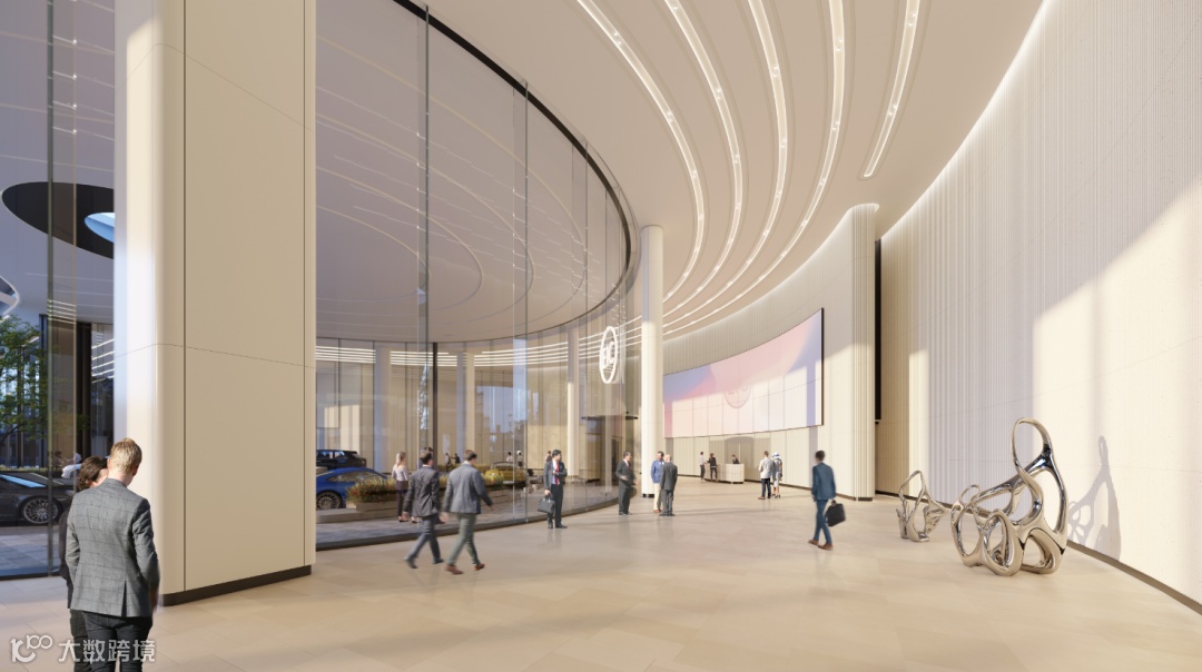 项目创新设计超40米直径豪华无雨环岛落客区,配备国内罕见的汽车直入建筑内部迎宾落客系统,结合3.6米高水晶旋转门,营造尊崇礼遇体验。首层采用11米高、2.4米宽整幅超白玻幕墙,单片面积约30㎡,与苹果旗舰店同款材质,打造通透视觉效果。
