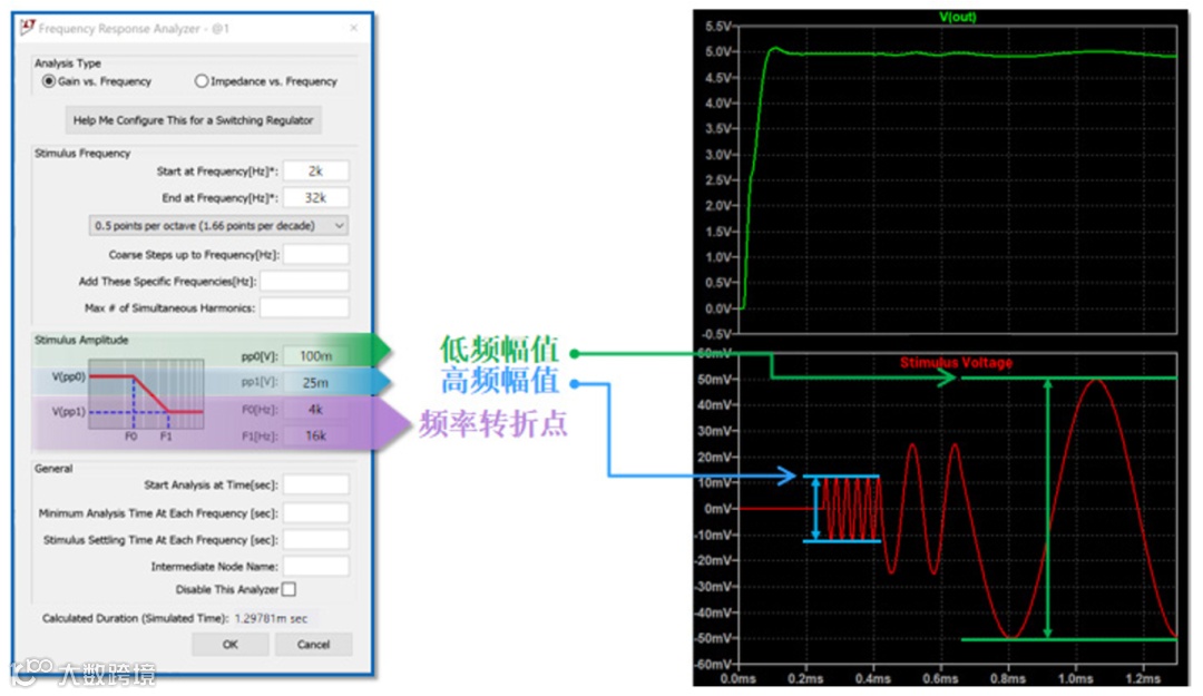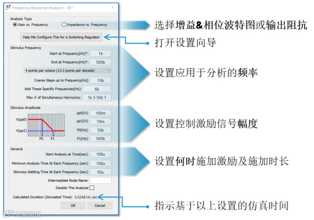 右键点击FRA组件可打开设置对话框,用于配置分析参数。主要包括:波特图/输出阻抗分析模式选择、频率范围设定、激励信号幅值控制、施加时间与持续时间设置,以及仿真耗时预估。不同参数组合将直接影响仿真时间。