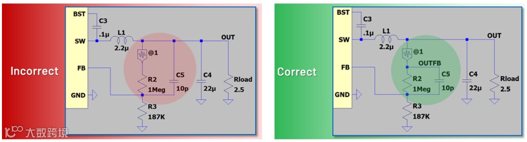 正确方式应中断反馈分压器与前馈电容路径。图6对比了错误与正确连接方式。