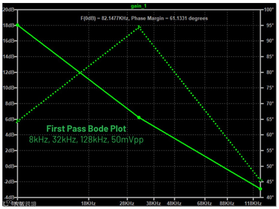交越频率F(0dB)对应增益为0dB的频率点,相位裕量反映系统稳定性。例如F(0dB)=82.15kHz,相位裕量61.13°,表明系统稳定。