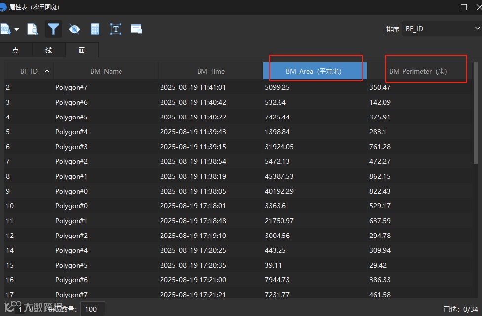 同理添加【周长】字段,确保单位与投影方式与面积一致。