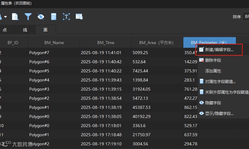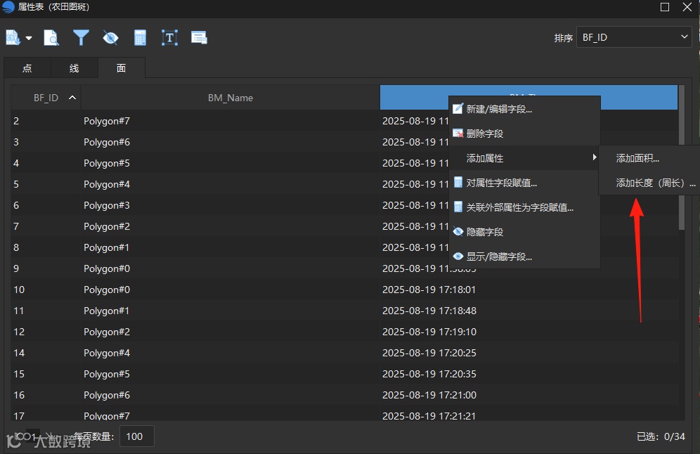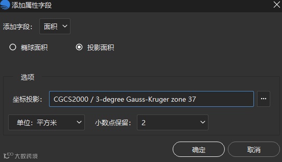 若原始数据无面积或周长字段,可在属性表中右键字段标题,选择【添加属性】→【添加面积】,设置坐标系、单位及小数位数。