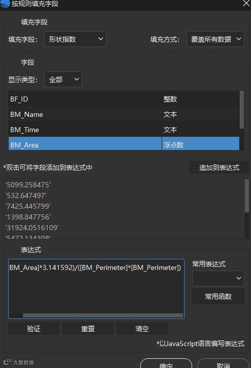 在表达式中输入:(4*[BM_Area]*3.141592)/([BM_Perimeter]*[BM_Perimeter])