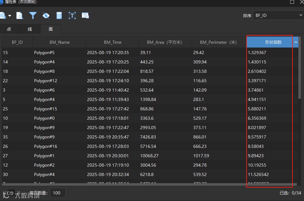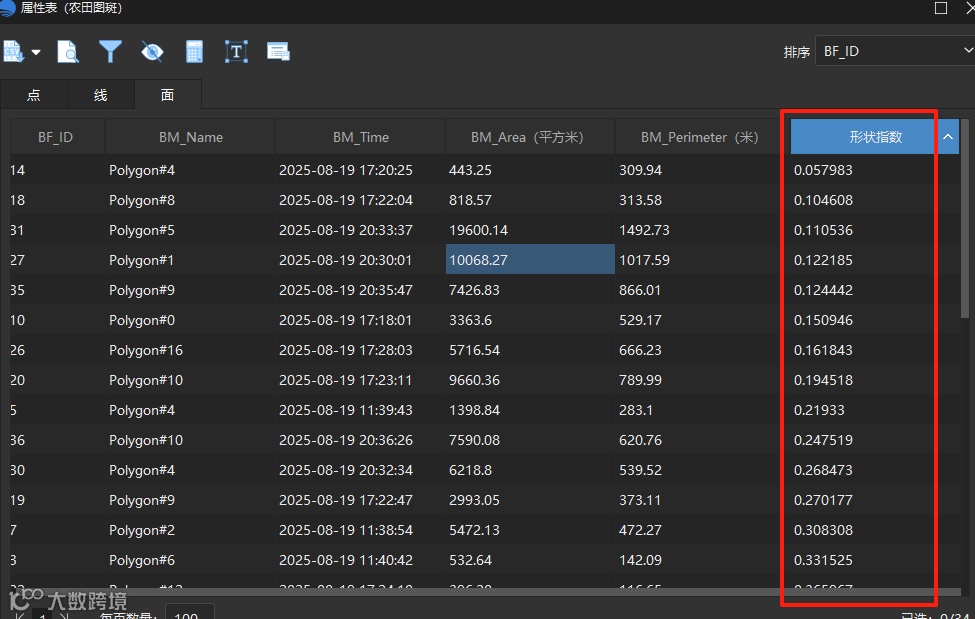 验证后确定,系统自动计算比值。对“形状指数”字段升序排序,数值越小代表越狭长。