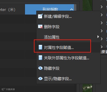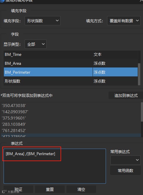 在属性表中新建字段“形状指数”(浮点型),右键该字段选择【编辑字段】,输入表达式:[BM_Area] / [BM_Perimeter]