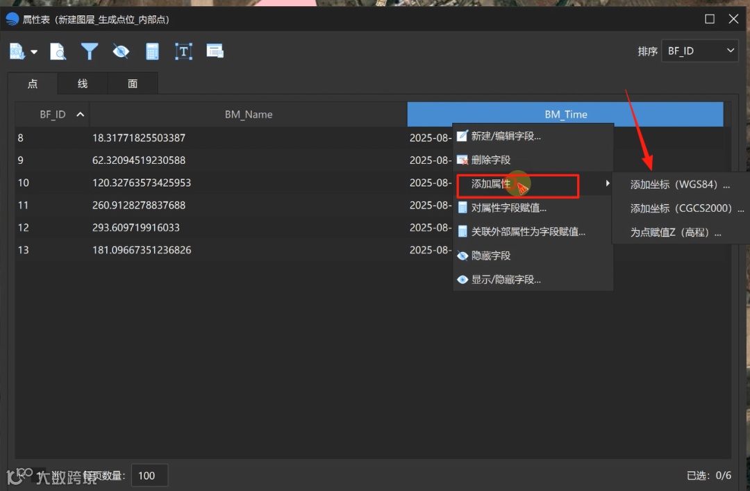 一键提取坐标:在属性表中右键可直接添加WGS84、CGCS2000等坐标系坐标,无需手动计算。