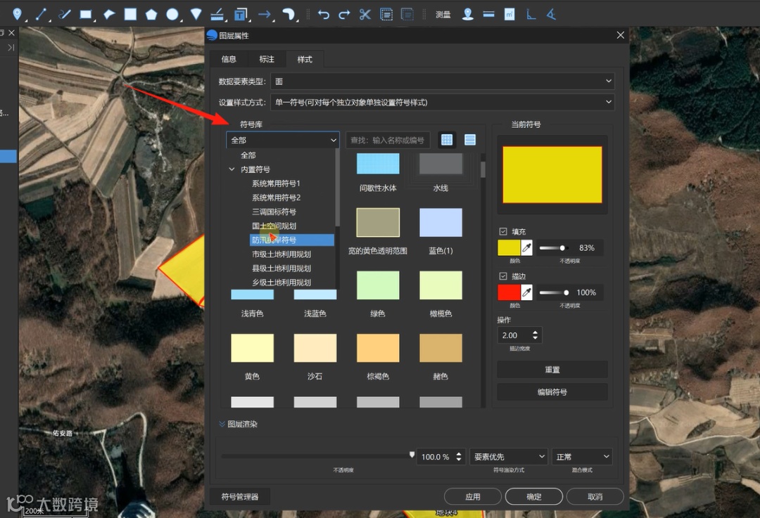 通常只能对整个图层统一样式;单个图斑调整需通过多层级菜单操作,步骤繁琐。缺乏行业专用符号库,需手动导入或自定义,增加配置成本。