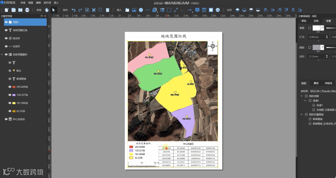 专业制图输出:切换至“打印制图”界面,可设置图幅、添加比例尺、指北针,并自动生成属性表格,支持高质量打印或导出汇报图。