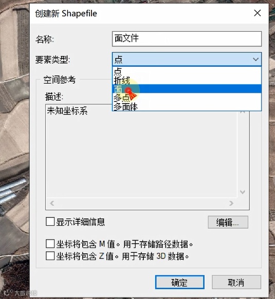 绘制前需通过“创建 Shapefile”新建面要素,并单独设置名称和类型。必须选择与底图一致的坐标系,且点、线、面需分别创建,无法一键切换。