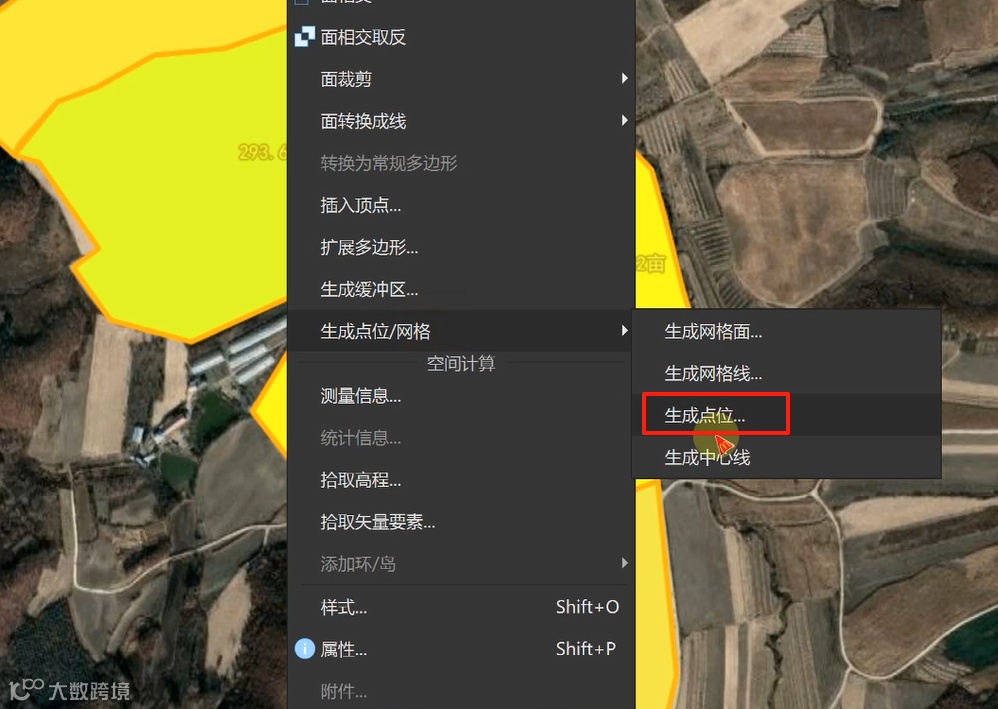 快速生成中心点:选中图斑→右键→生成点位/网格→生成点位,支持多种生成方式。