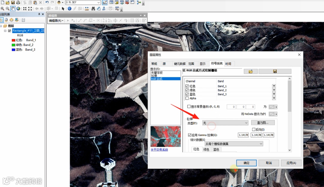 需预先导入影像数据,导入后常出现颜色偏差,需进入“图层属性→符号系统”手动调整拉伸类型为“无”才能正常显示。