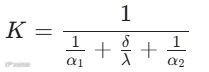 总热阻由“热流体侧对流传热热阻、板片导热热阻、冷流体侧对流传热热阻”三部分组成,对应的K值计算公式为: