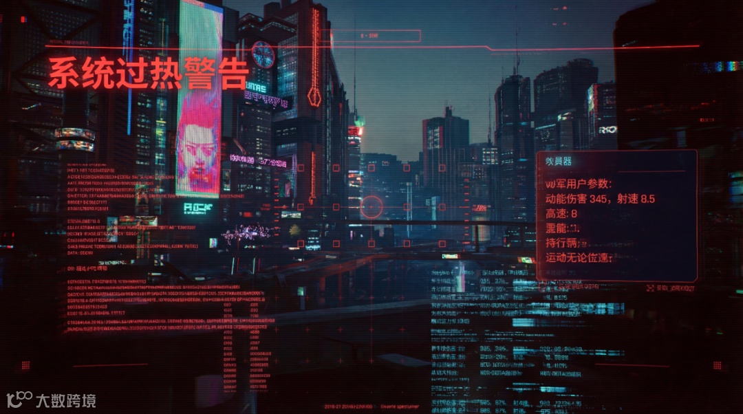 提示词:以第一人称视角(HUD)呈现类似《赛博朋克 2077》义眼扫描的界面。画面被红色与蓝色数据流覆盖,模拟科技感氛围。左上角醒目位置显示 “系统过热警告”。画面右侧列出武器参数列表,明确写着 “动能伤害 345,射速 8.5”。整个页面布满大量数据文字,字体要呈现出轻微的信号干扰故障效果(Glitch),仿佛系统正面临不稳定状况,强化赛博朋克风格。尺寸16:9