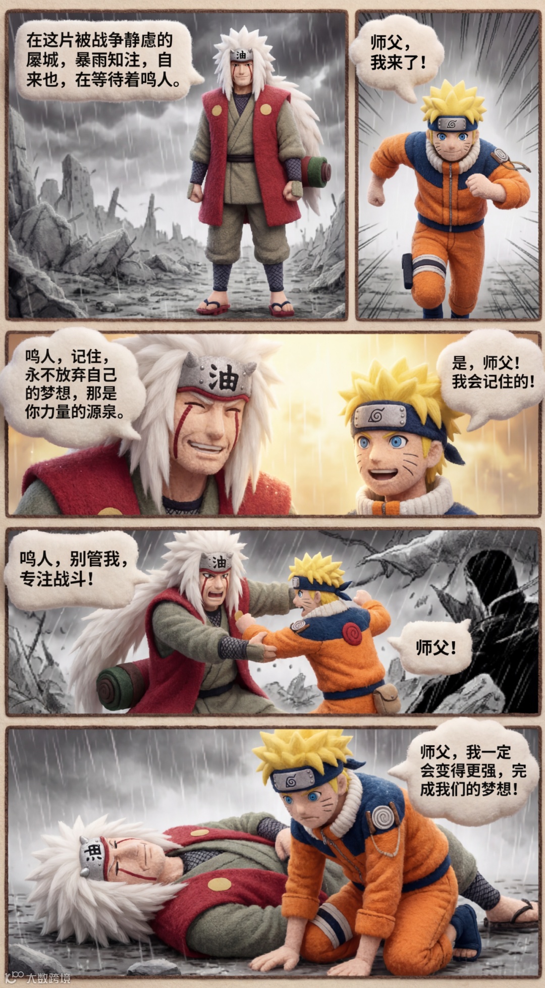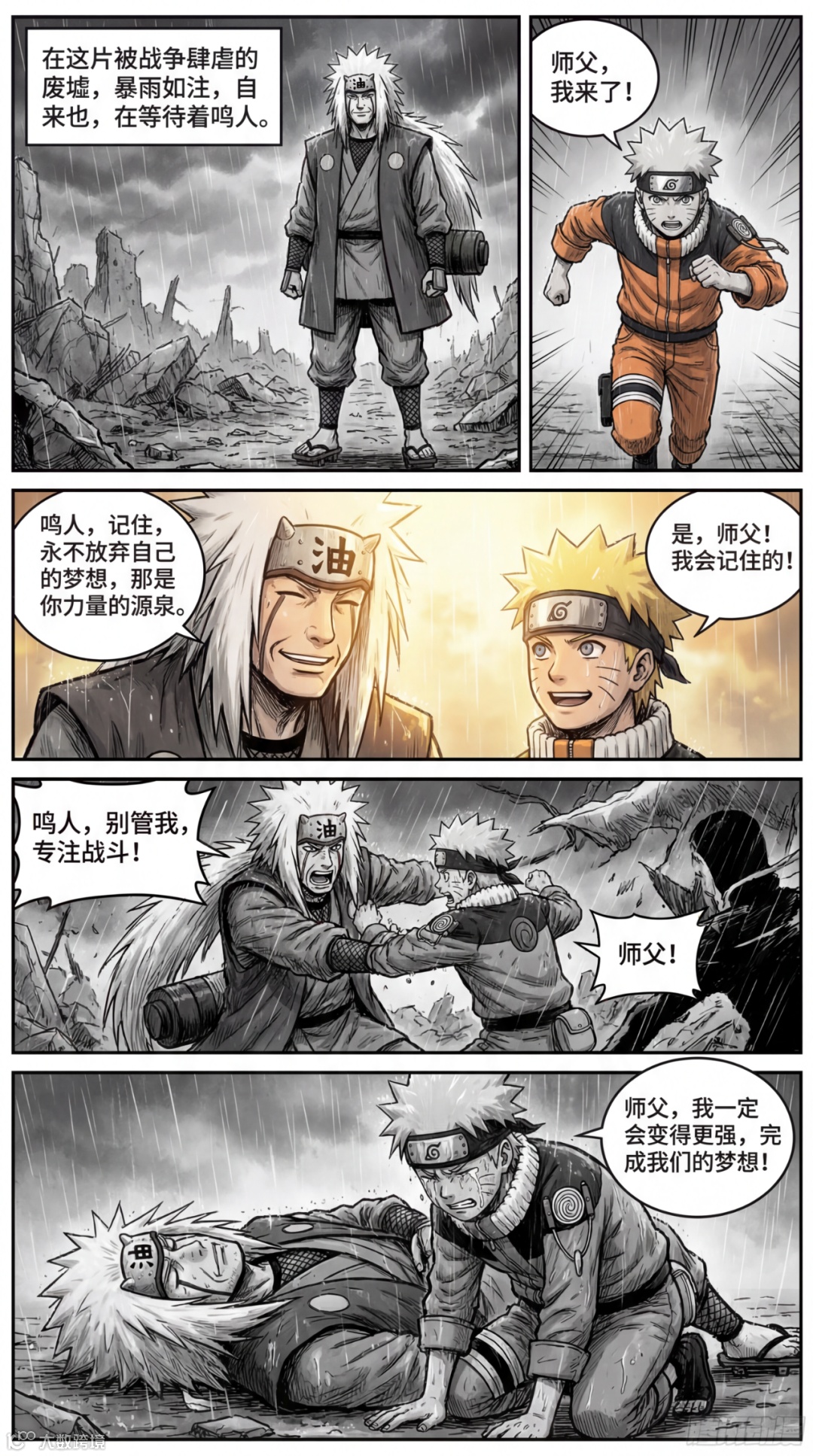 提示词:创作一组分镜漫画,表现自来也与鸣人最后时刻的情感交流。画面一:在暴雨中的废墟,自来也站立,眼神坚毅,等待鸣人。旁白:“在这片被战争肆虐的废墟,暴雨如注,自来也,在等待着鸣人。”画面二:鸣人冲向自来也,眼中充满敬意与担忧。鸣人内心独白:“师父,我来了!”画面三:自来也微笑着对鸣人说话,传授最后的教诲,画面中有温暖的光线照射。自来也:“鸣人,记住,永不放弃自己的梦想,那是你力量的源泉。” 鸣人:“是,师父!我会记住的!”画面四:自来也与鸣人在暴风中对抗敌人,自来也受伤,战斗激烈。自来也:“鸣人,别管我,专注战斗!” 鸣人:“师父!”画面五:自来也倒下,鸣人眼中闪烁泪光,心痛与誓言并存,画面充满悲痛与决心。鸣人:“师父,我一定会变得更强,完成我们的梦想!”尺寸9:16