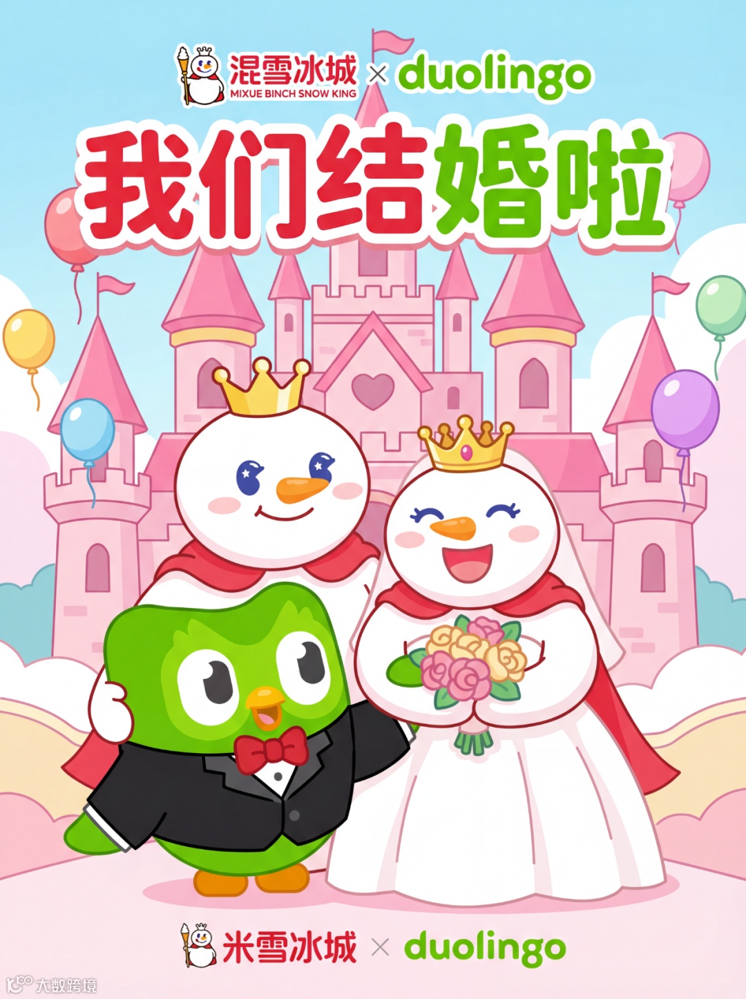 提示词:设计一张名为 “我们结婚啦” 的蜜雪冰城与多邻国联名海报。画面中心,蜜雪冰城的雪王头戴金色皇冠,身着白色婚纱,手捧鲜花束,脸上洋溢着幸福笑容。多邻国的小绿鸟穿着黑色帅气西装,系着红色领结,亲昵地挽着雪王。背景是梦幻的粉色城堡,周围飘着彩色气球,城堡上方有 “我们结婚啦” 的艺术字体标题,颜色采用蜜雪冰城的红白色与多邻国的绿色搭配,突出联名主题,营造甜蜜浪漫氛围。尺寸3:4
