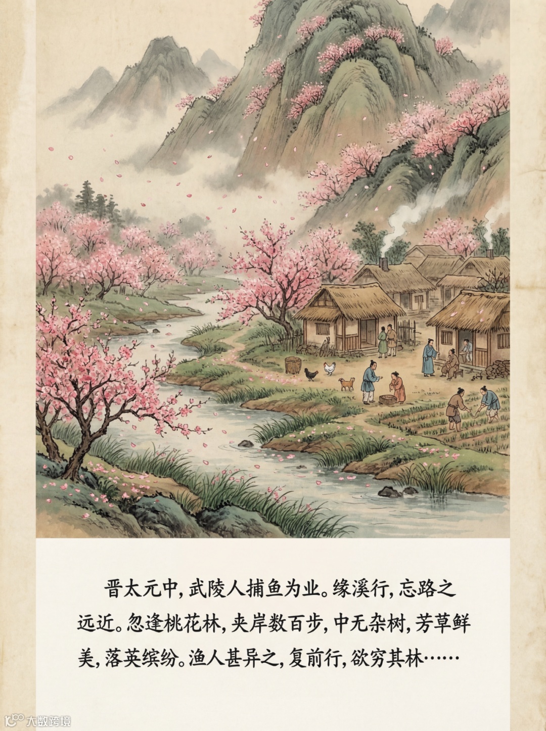 提示词:绘制一幅具有中国古代绘画风格的作品,展现《桃花源记》中的场景。画面主体为一片宁静祥和的世外桃源。远处青山连绵,云雾缭绕,山间桃花烂漫,粉色花瓣随风飘落。一条清澈溪流蜿蜒穿过画面,溪水潺潺,溪边芳草鲜美,落英缤纷。顺着溪流,可见一座古朴的小村庄,屋舍俨然,错落有致,屋顶覆着茅草,烟囱中升起袅袅炊烟。村间阡陌交通,鸡犬相闻,村民们或在田间劳作,或在屋前闲谈,身着古朴衣衫,神情悠然自得。画面底部留出空白区域,工整地书写《桃花源记》原文:“晋太元中,武陵人捕鱼为业。缘溪行,忘路之远近。忽逢桃花林,夹岸数百步,中无杂树,芳草鲜美,落英缤纷。渔人甚异之,复前行,欲穷其林……”,文字字体采用古朴的楷书,与整幅画的古风韵味相契合。尺寸3:4