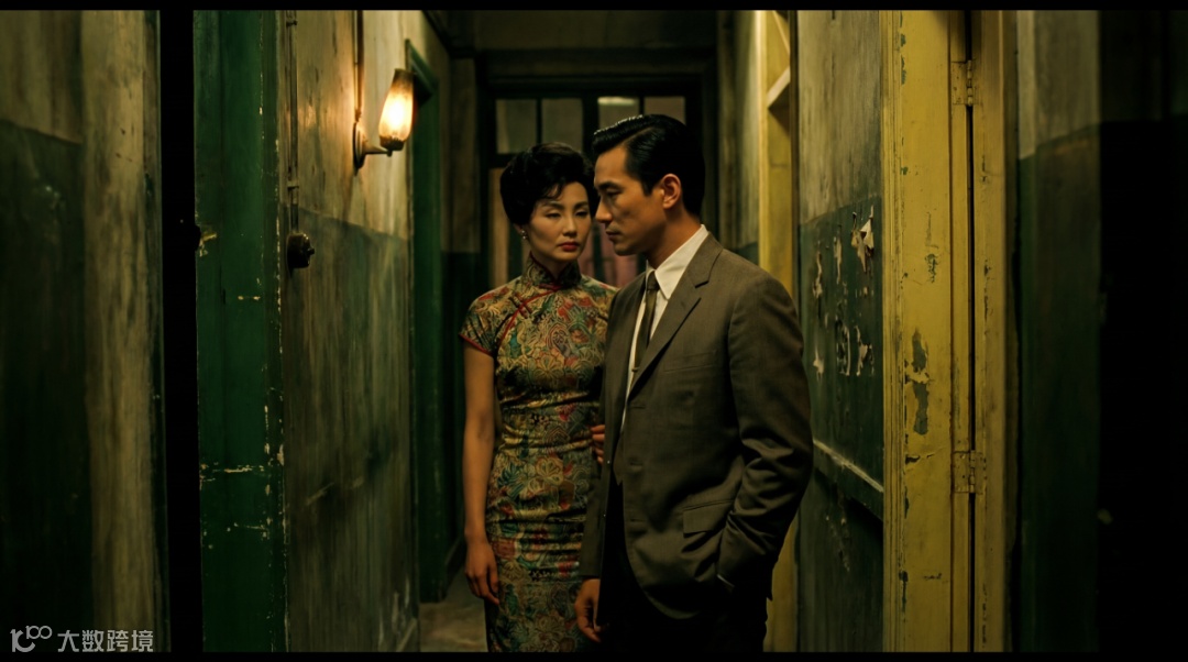 提示词:以王家卫《花样年华》的风格创作画面,展现一对男女在狭窄走廊擦肩而过的瞬间。采用抽帧效果,让画面有独特节奏感。整体色调浓郁,以绿色与黄色为主,营造复古氛围。画面高对比度,亮处明艳,暗处深沉,暗部添加噪点,增强复古质感。细致描绘男女的穿着,如女士精致旗袍、男士笔挺西装,捕捉他们眼神交汇、微微侧身等细腻动作与神情,展现含蓄而微妙的情感。尺寸16:9