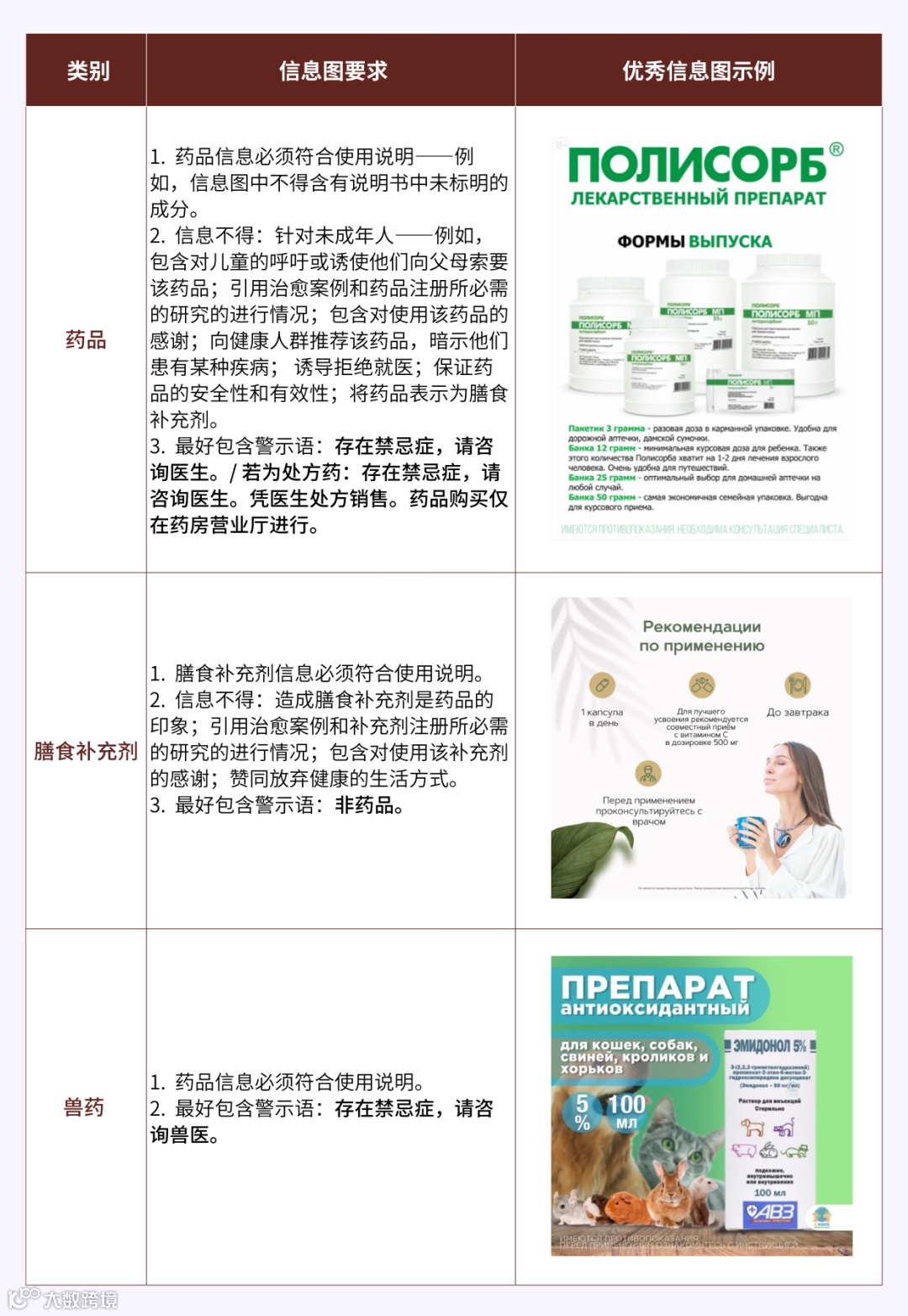 对于“药品和膳食补充剂”及“兽药”类别的商品,其信息图有额外要求: