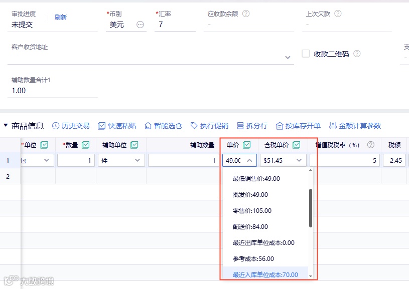 开启,都会按照单据中的币别展示该币别的最近销售价。