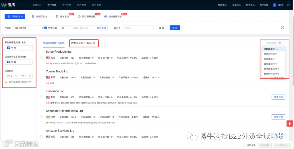- 按活跃度、交易金额、贸易伙伴数量等维度排序,优先跟进高价值客户。