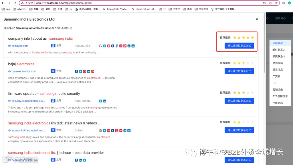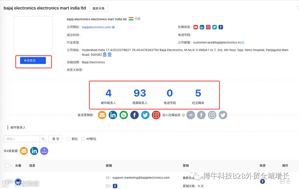 - 通过关键词、公司名称搜索目标客户,获取其WhatsApp、邮箱等联系方式。