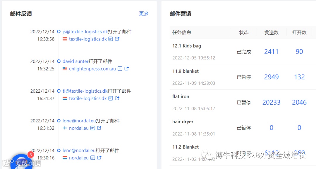 - 支持一键群发,并实时追踪邮件打开、点击情况,便于二次跟进;