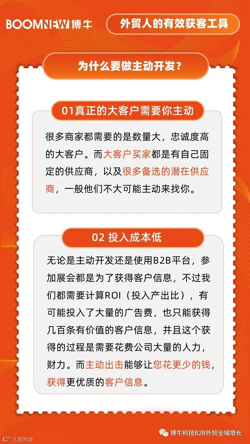 主动开发已成为外贸企业获取大客户的核心手段。相比传统B2B平台客户碎片化、谷歌推广成本高、社交媒体开发效率低等问题,系统化主动获客具备以下优势: