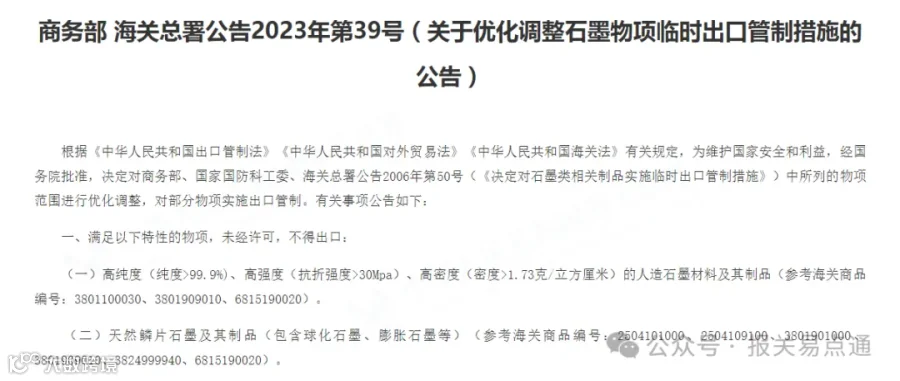 根据商务部、海关总署2023年第39号公告,石墨类物项实施差异化管制,主要分为两类: