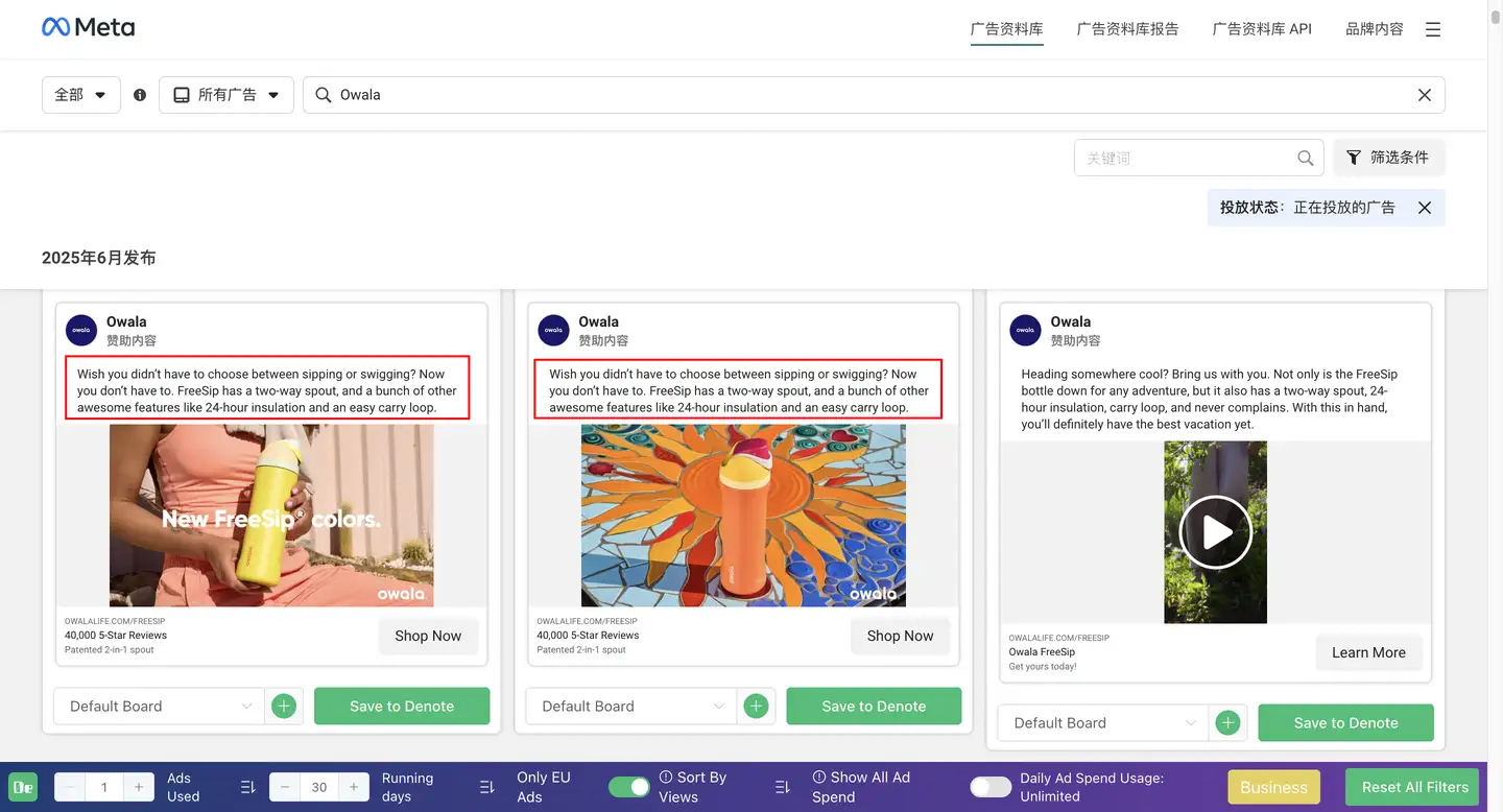 观察Owala的Facebook营销动态,通过Denote我们发现,品牌投放的超过30天的广告素材中,曝光量较高的广告有个共通点:都使用了“是不是希望不必在小口小口地喝水和大口大口地喝水之间做出选择?现在,你无需再为此纠结了。FreeSip拥有双向出水嘴”这样一套文案。可见品牌也非常擅长通过强化最大卖点来加强对目标消费者的吸引力。
