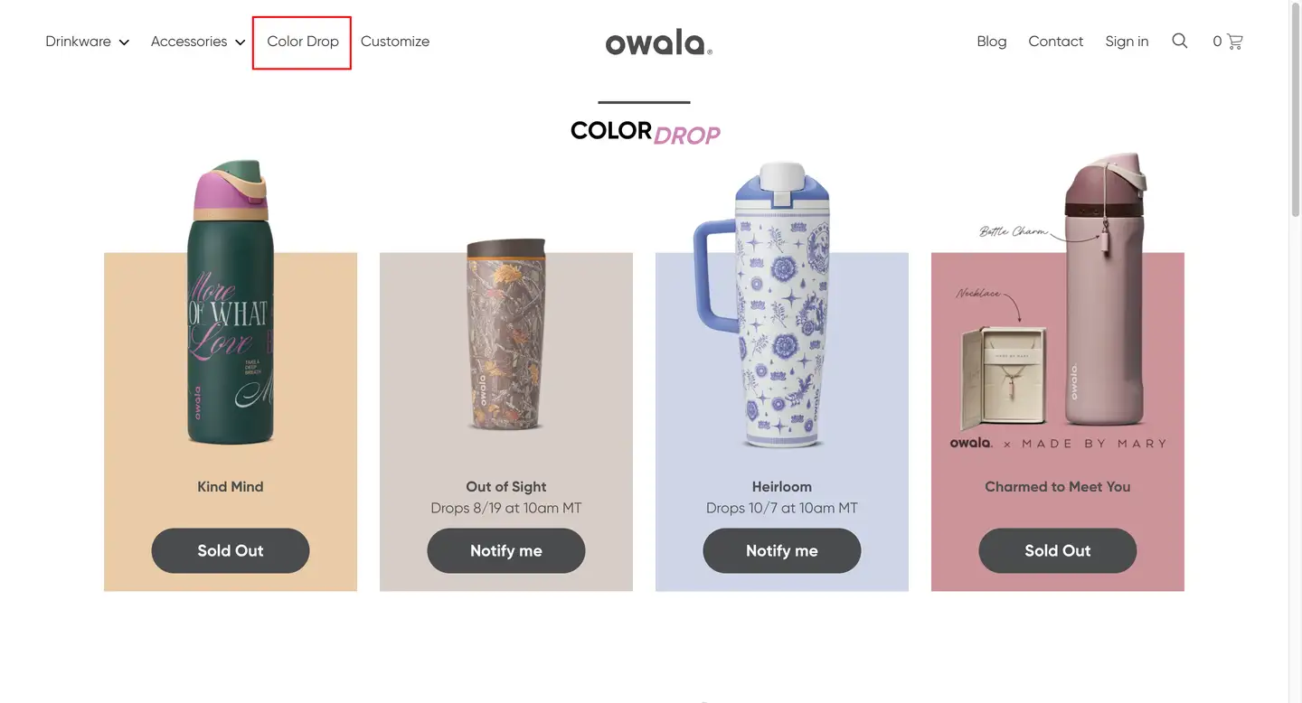 光有好产品不够,Owala的营销把稀缺感和参与感玩得很溜。他们推出的Color Drop模式堪称DTC品牌教科书:定期发布限量配色的产品,发售前只露图不露时间、价格,想知道消息就得关注社媒或订阅邮件。