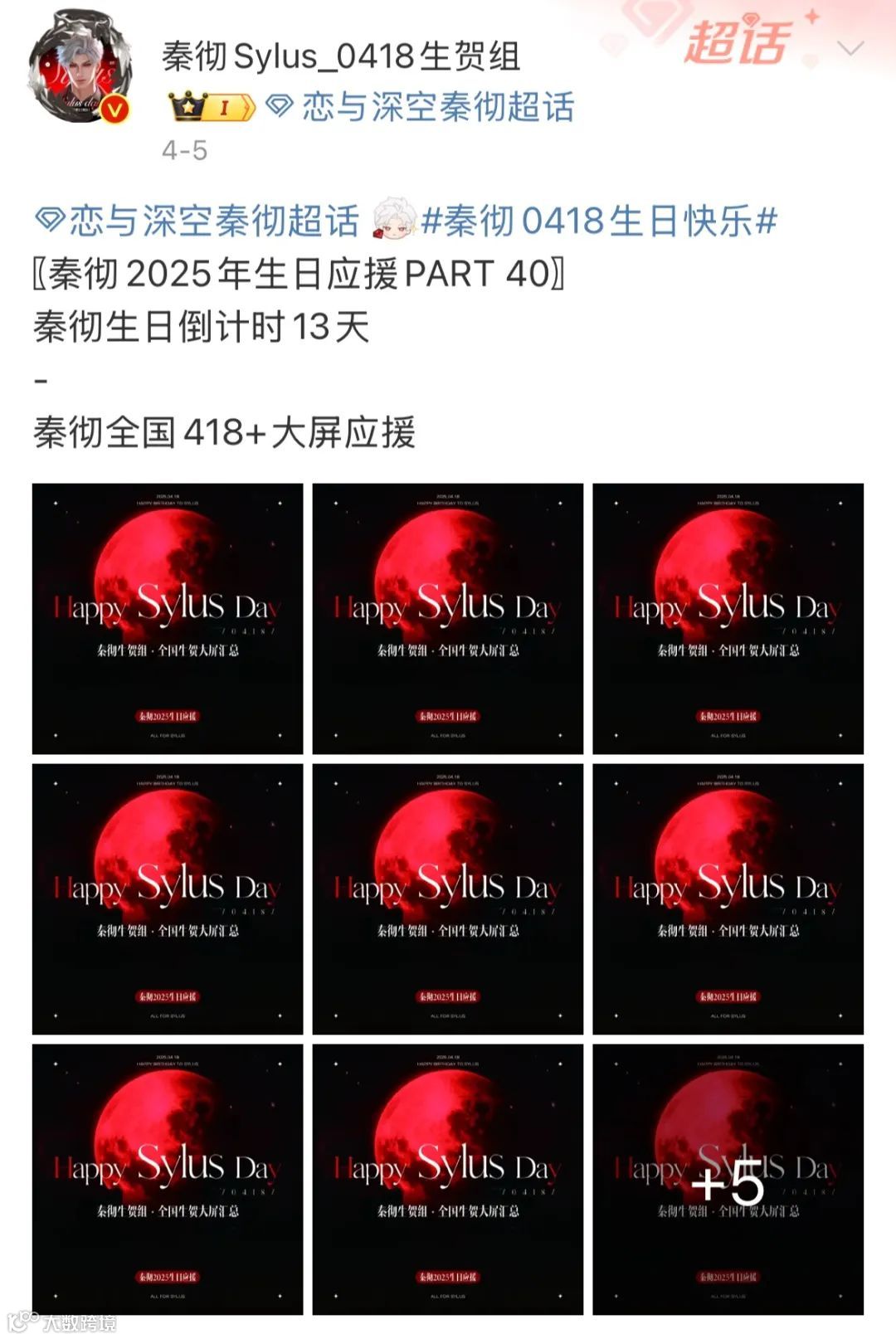 截至4月10日,秦彻生贺组共公布了50个生日应援项目。